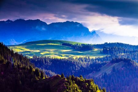 11:00-14:00游玩江布拉克景区;这里拥有雪山、群山、林海、山泉、湖泊、草地、鲜花以及牛羊和毡房,就像一幅幅秀美的山水画卷。在这里有一个特别奇特的怪坡现象,可以亲自体验乘坐自行车上坡像下坡,下坡像上坡的感觉;14:00-15:00自行享用午餐。